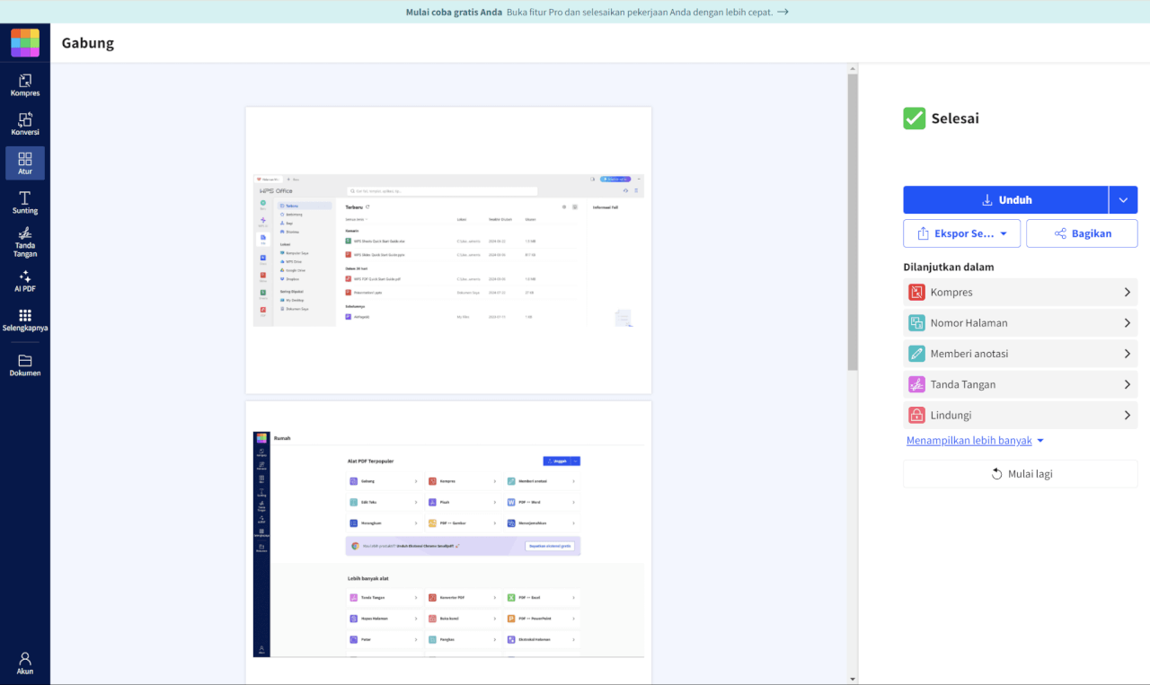 Fleksibilitas: Alat ini menawarkan fleksibilitas karena kamu dapat menyusun ulang, mengedit, menghapus, dan menambahkan lebih banyak file ke dokumen yang diunggah sebelum menggabungkannya.