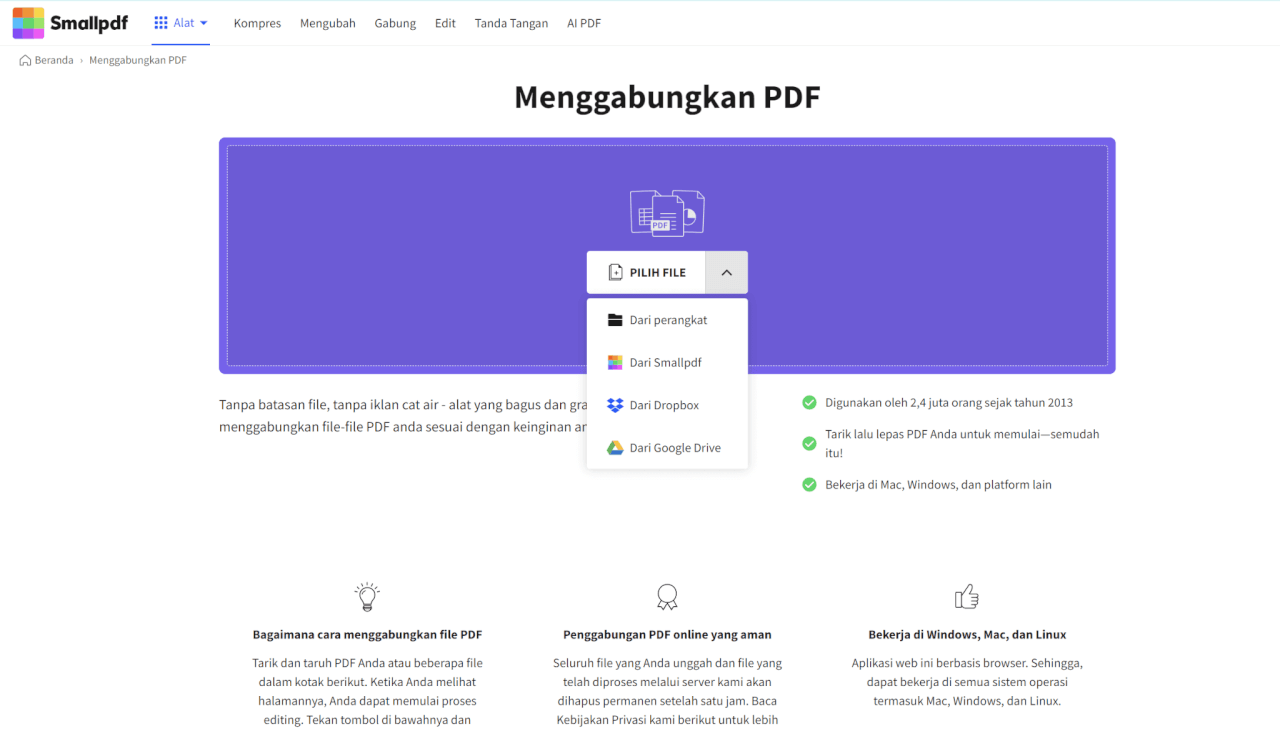 Smallpdf Merge PDF adalah alat yang bagus untuk menggabungkan atau mengompres file PDF. Fitur-fiturnya memungkinkan pengguna untuk mengedit PDF mereka tanpa mengorbankan integritas dokumen.