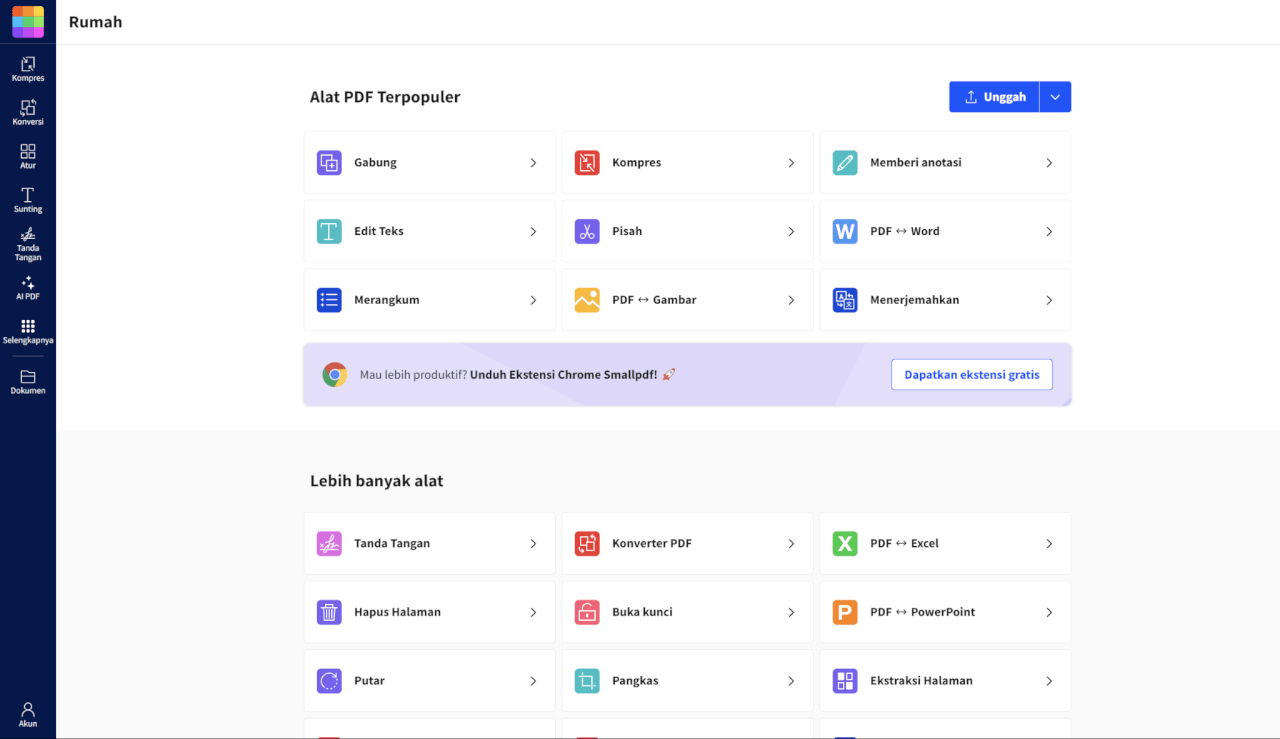Smallpdf memiliki antarmuka yang intuitif dan modern, tetapi tidak menawarkan fitur penyesuaian kepada pengguna. Pengguna baru mungkin kesulitan menavigasi platform. Namun, dengan penggunaan yang sering, akan menjadi lebih mudah untuk menavigasi platform ini.