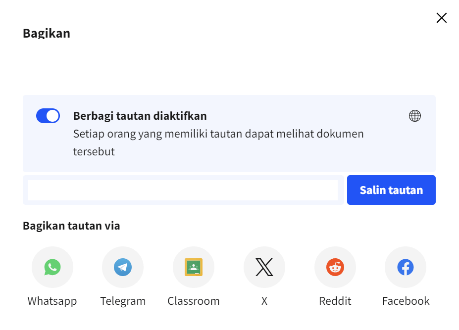 Mengklik tab "bagikan" akan menghasilkan tautan yang bisa kamu bagikan dengan timmu untuk mengakses dokumen.