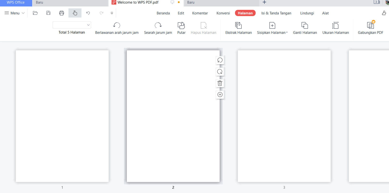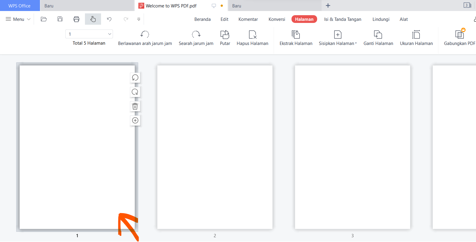 2. Panel "Pengelolaan Halaman" akan muncul di layar. Di sini, Anda dapat melihat gambar miniatur dari setiap halaman dalam dokumen, beserta opsi untuk mengurutkan, menghapus, dan menyisipkan halaman.