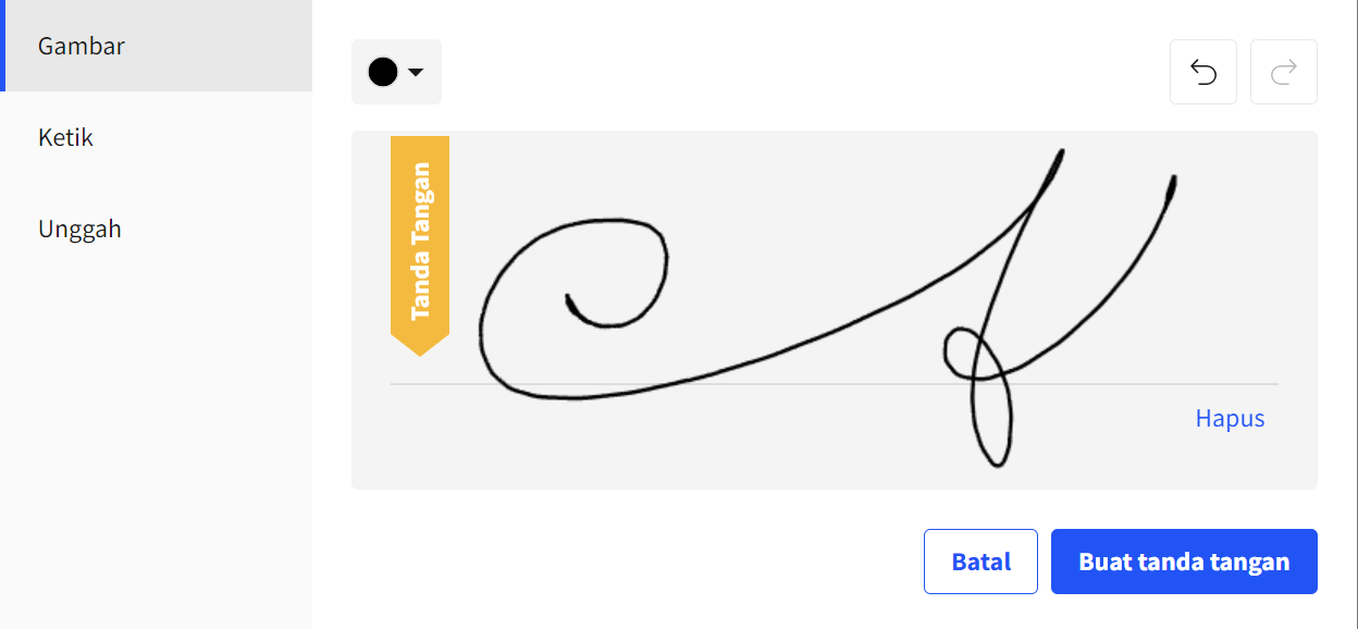 Langkah 4: Klik opsi "tanda tanganmu". Kamu akan melihat opsi untuk menggambar tanda tangan, mengunggah gambar, atau mengetik inisialmu. Pilih yang sesuai dan klik "buat". Kamu bisa menggunakan touchpad atau mouse untuk menggambar tanda tangan.