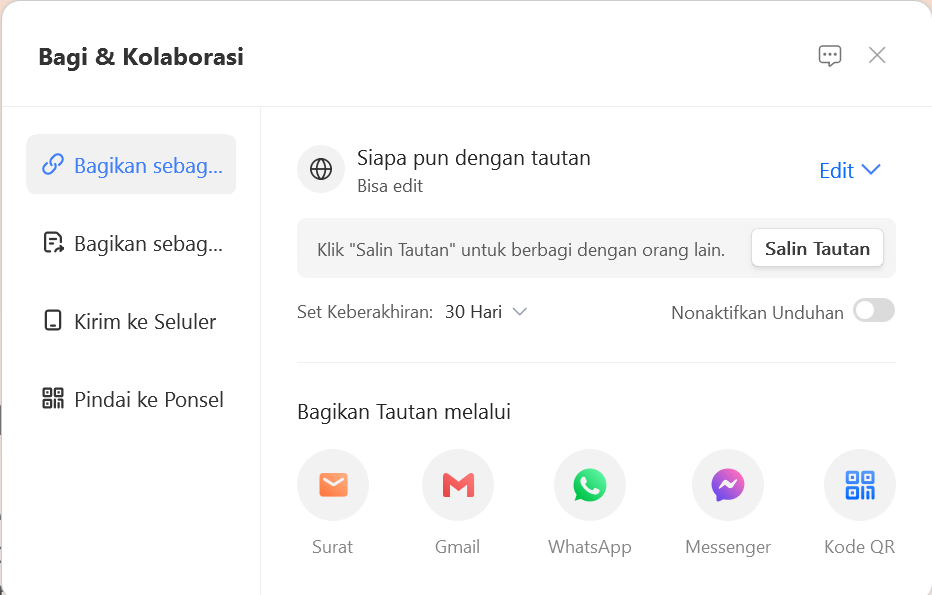 Langkah 3: Pilih tombol "Bagikan" dari menu dropdown. Sekarang Anda akan mendapatkan dua opsi untuk berbagi file; Anda dapat membagikannya baik sebagai tautan atau PDF.
