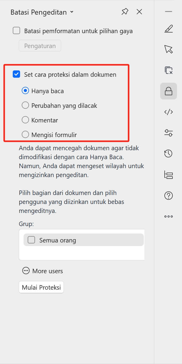 Tetapkan Perlindungan: Opsi ini menawarkan cara tambahan untuk melindungi dokumen Anda dari suntingan yang tidak perlu. Anda dapat memilih untuk: